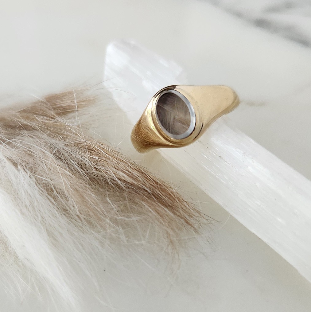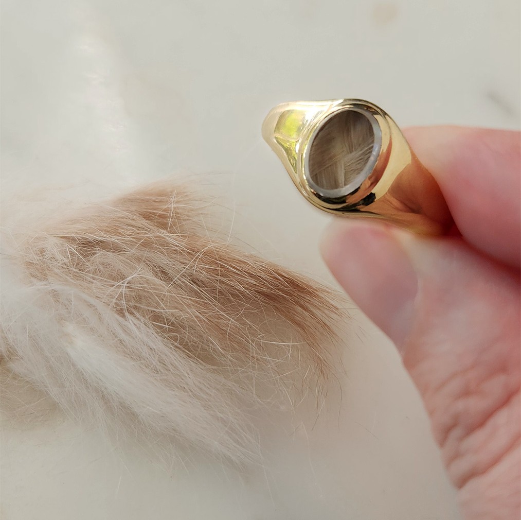 A classic ring design with a modern twist! This chunky ring is handcrafted with a pernanent-set glass compartment on top to hold a tiny knot of your loved ones’ hair or fur. The interior surface is perfect for personalizing with initials or a name.